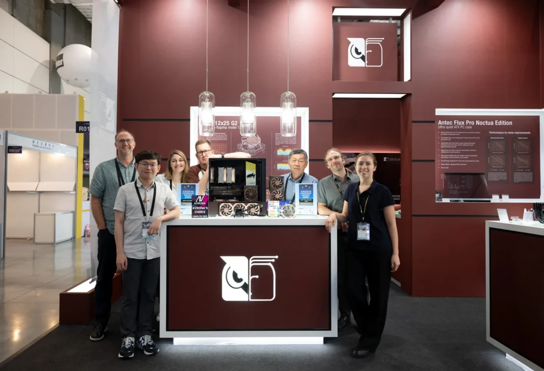 Noctua ha esposto un prototipo aggiornato del suo sistema di raffreddamento a liquido basato su tecnologia a termosifone, sviluppato in collaborazione con Calyos. Questo sistema utilizza un radiatore da 360 mm e funziona senza pompa, sfruttando la differenza di temperatura per far circolare il liquido. Il design include tubi flessibili e un evaporatore ottimizzato per ridurre i punti caldi. Al momento, non è stata annunciata una data di rilascio per questo prodotto.